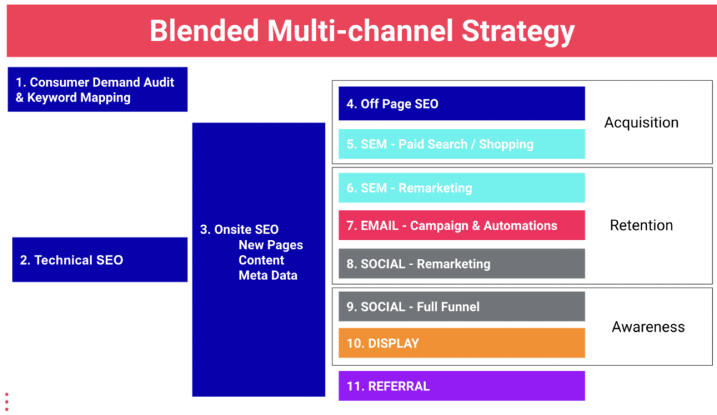 A Multi-channel Strategy is simply a strategy that incorporates multiple channels & activities implemented in and can’t stress this enough; in a complementary manner to achieve a common goal. Examples could be growth in Revenue, Sessions, Customers or improvement in Retention, Repurchase Rate or a decrease in Paid Marketing spend.